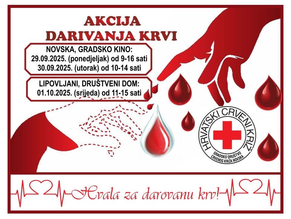 - u Novskoj u utorak, 30. rujna 2025. u Gradskom kinu u vremenu od 10 - 14 sati,