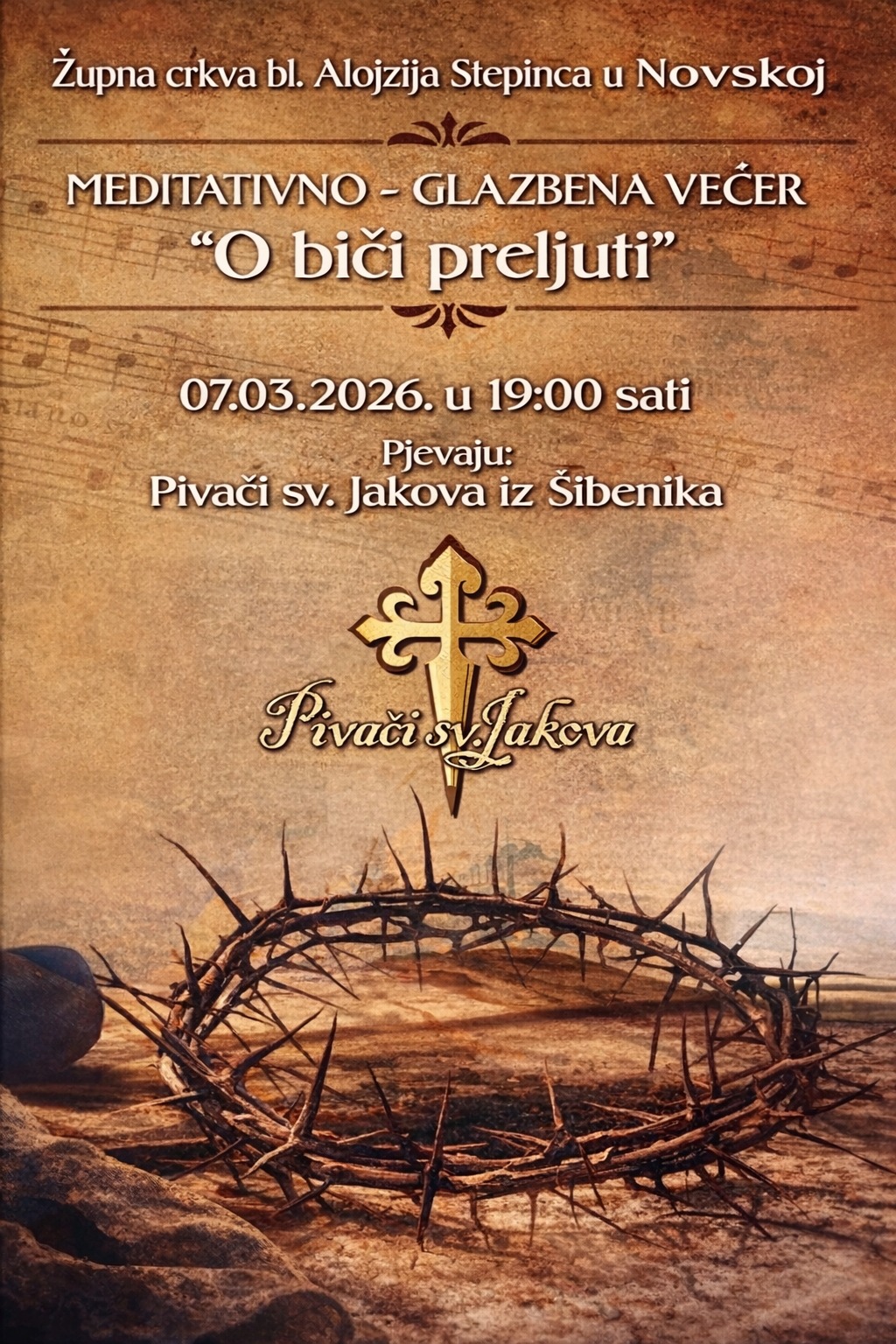 Župa bl. Alojzija Stepinca u Novskoj poziva Vas na meditativno-glazbenu večer na kojoj će nastupiti Pivači sv. Jakova iz Šibenika – „O biči preljuti“ koja će se održati u subotu, 7. ožujka s početkom u 19:00 sati.